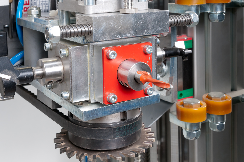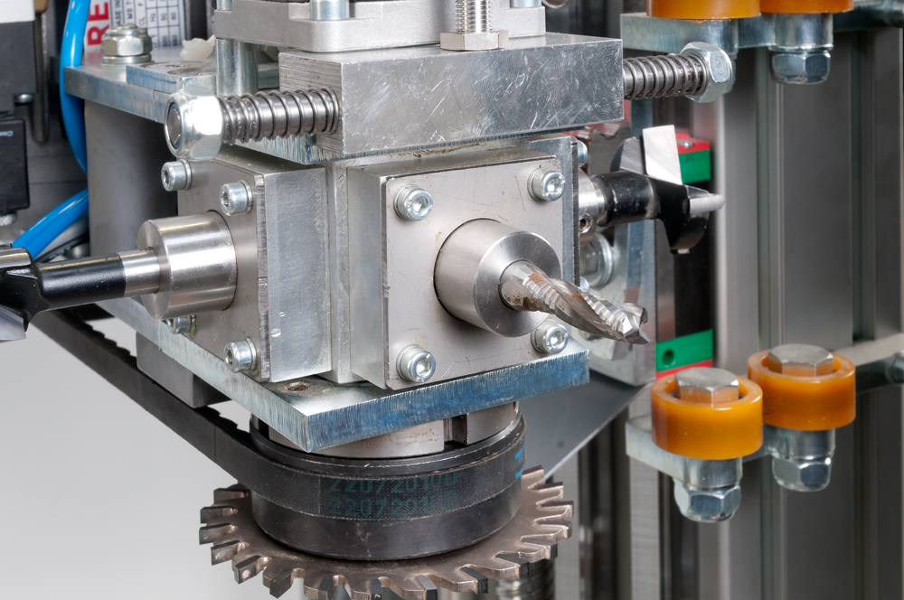 - Stroj je opremljen z izvrtino s 4 vpenjali in vgrajeno žago.