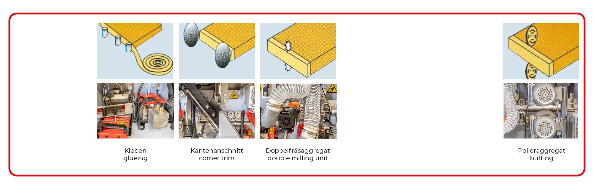 - double trimming unit for trimming the edge overhang on the workpiece (top/bottom) ; 0,35KW motor per unit and 12000min-1